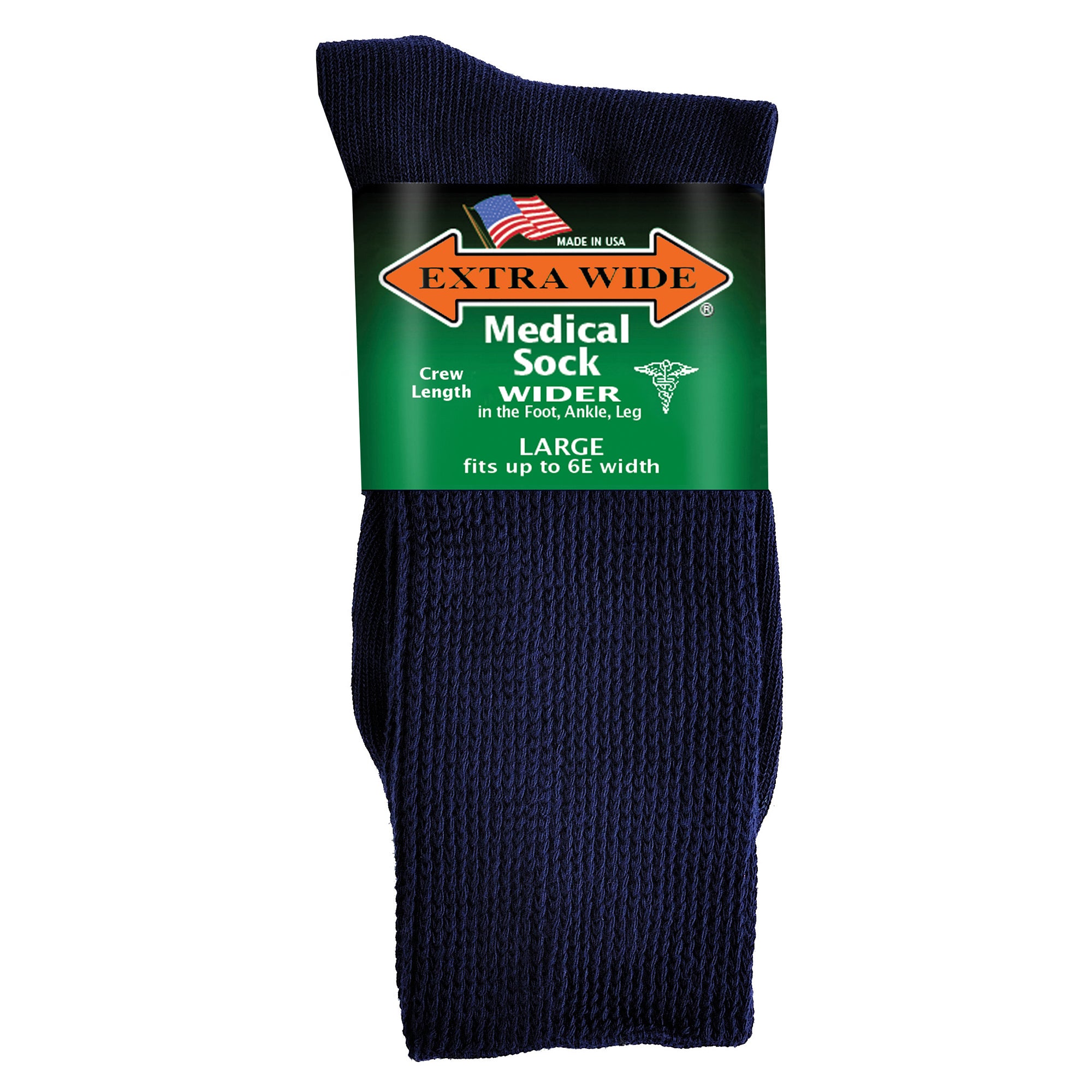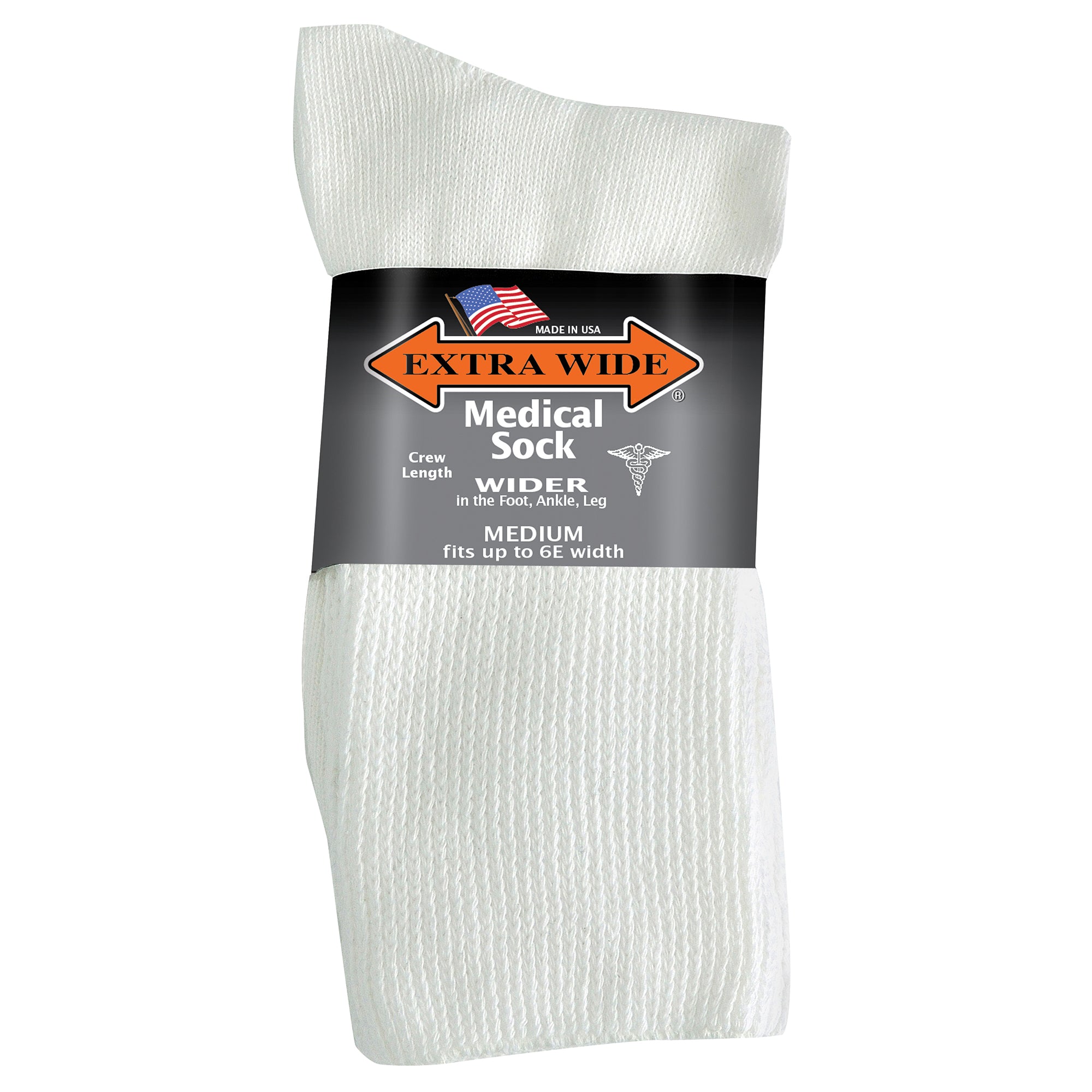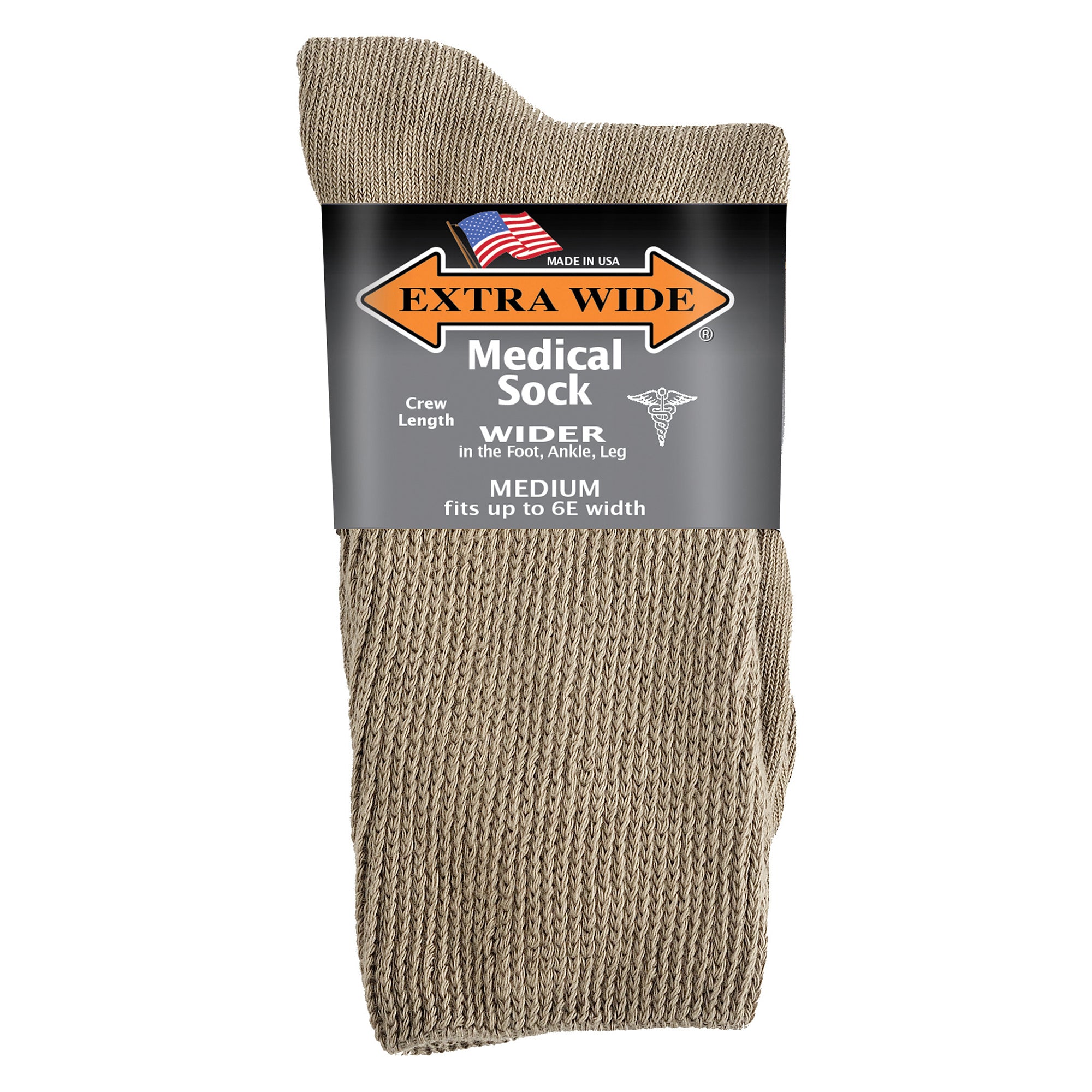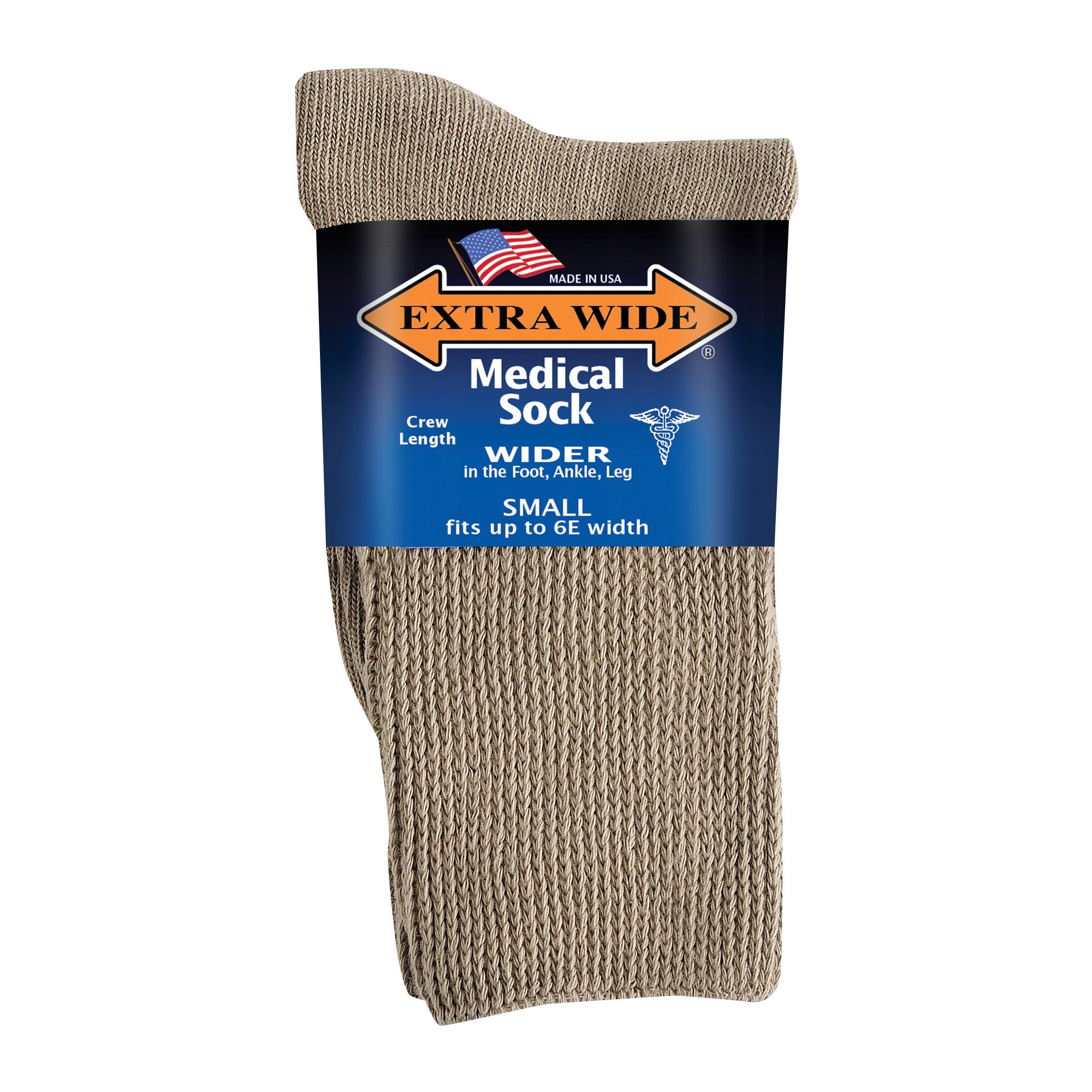 Extra Wide Medical crew socks are a godsend for people with Edema or any condition where feet, ankles, or calves are wide or swollen. Tired of squeezing into tight fitting medical socks? Then these socks are for you. Made from soft ring spun cotton for comfort. These socks can stretch up to 25 inches in the calf while still maintaining their shape. Infused with Microban to help inhibit the growth of odor causing bacteria. If you have a cast or an Unna boot, our sock will slip right over it for added protection. Rest assured, we’ve got you covered! The socks have an inverted toe seam, for a seam free feel. Available in white, black, navy, and tan and 3 sizes to ensure a correct and comfortable fit. The socks are unisex and fit shoe sizes from women’s size 7 through men’s size 16 up to a 6E width. Made in the USA!