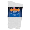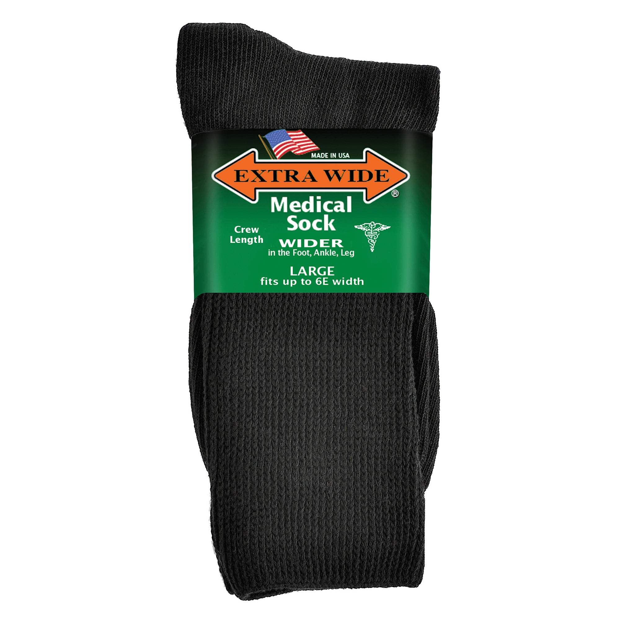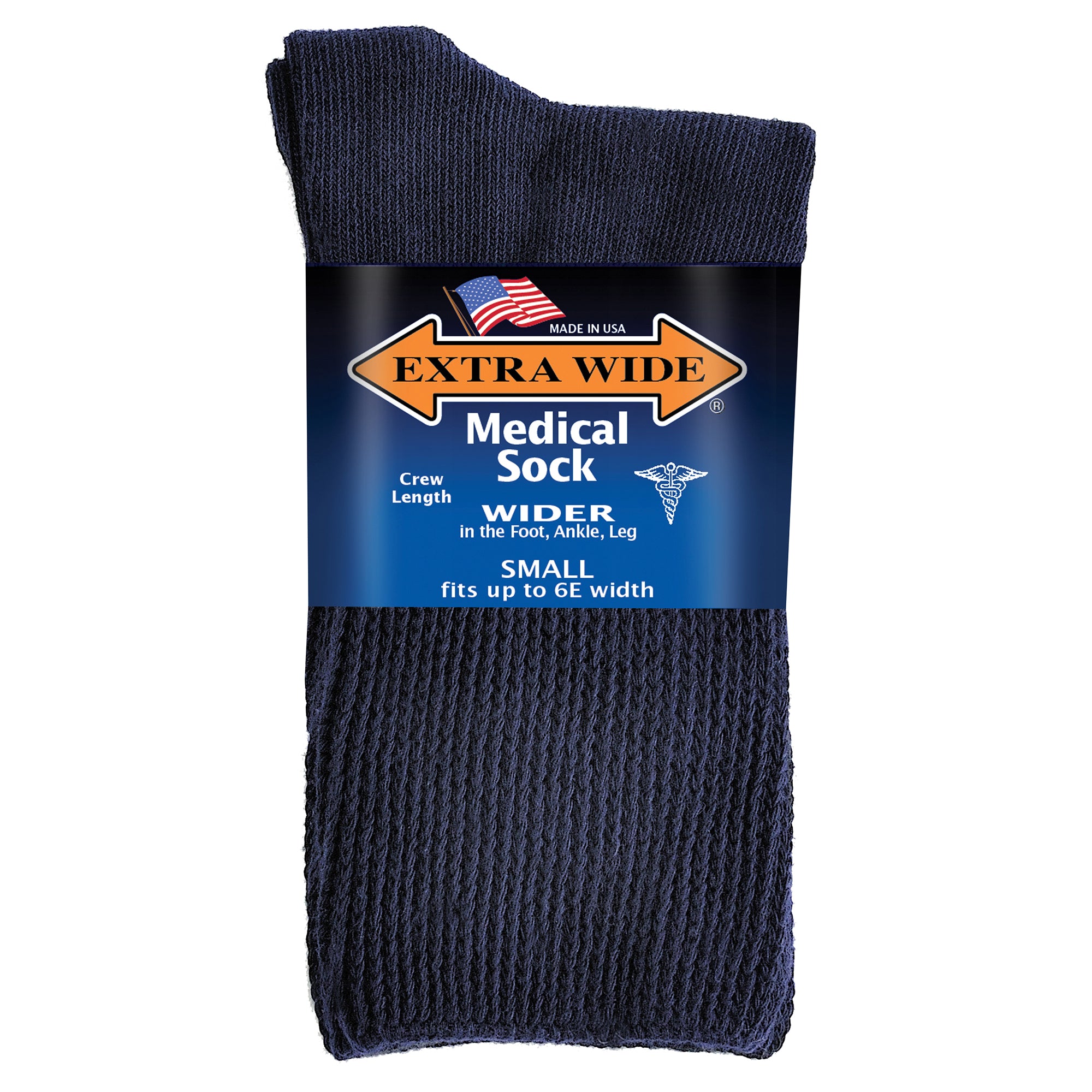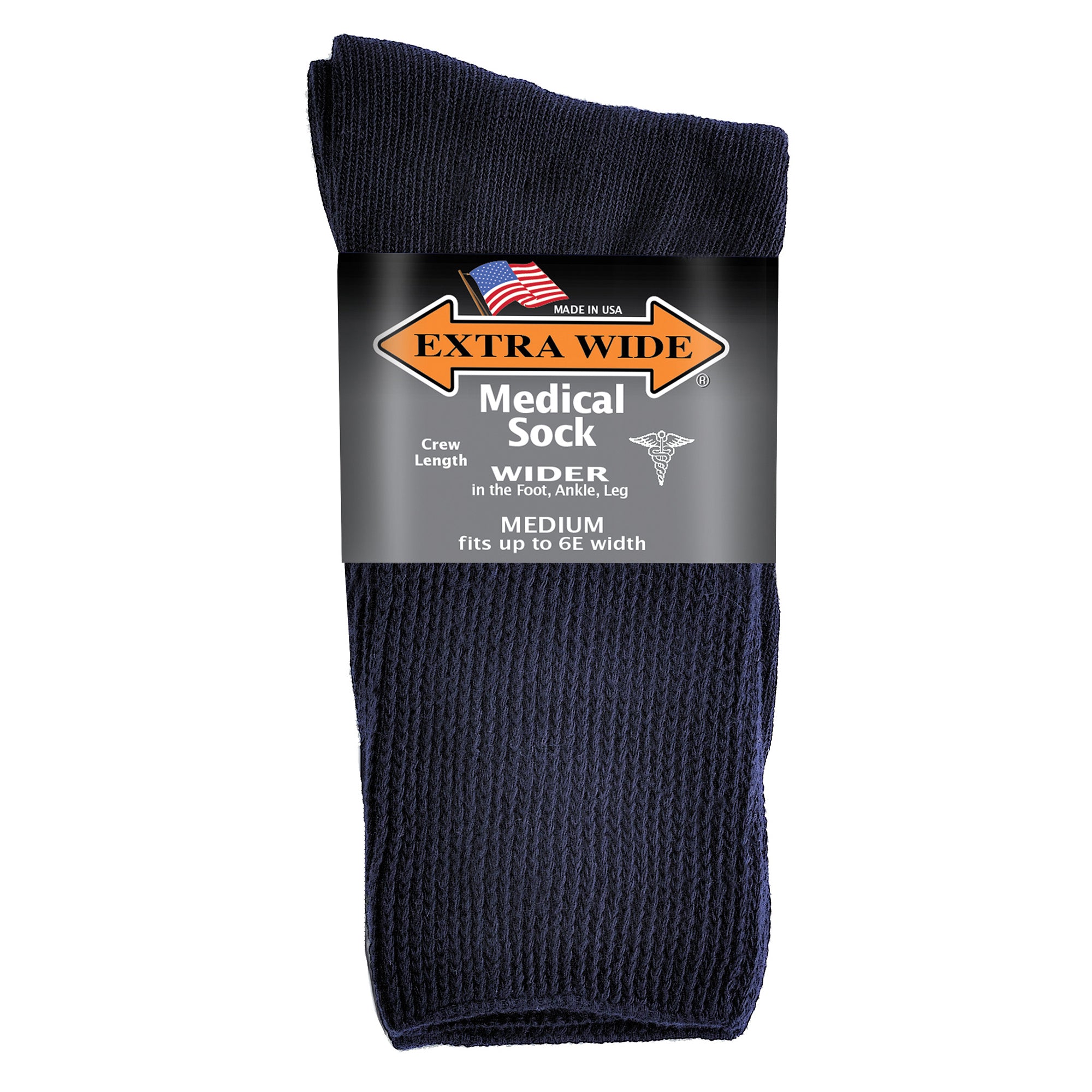 Extra Wide Medical crew socks are a godsend for people with Edema or any condition where feet, ankles, or calves are wide or swollen. Tired of squeezing into tight fitting medical socks? Then these socks are for you. Made from soft ring spun cotton for comfort. These socks can stretch up to 25 inches in the calf while still maintaining their shape. Infused with Microban to help inhibit the growth of odor causing bacteria. If you have a cast or an Unna boot, our sock will slip right over it for added protection. Rest assured, we’ve got you covered! The socks have an inverted toe seam, for a seam free feel. Available in white, black, navy, and tan and 3 sizes to ensure a correct and comfortable fit. The socks are unisex and fit shoe sizes from women’s size 7 through men’s size 16 up to a 6E width. Made in the USA!