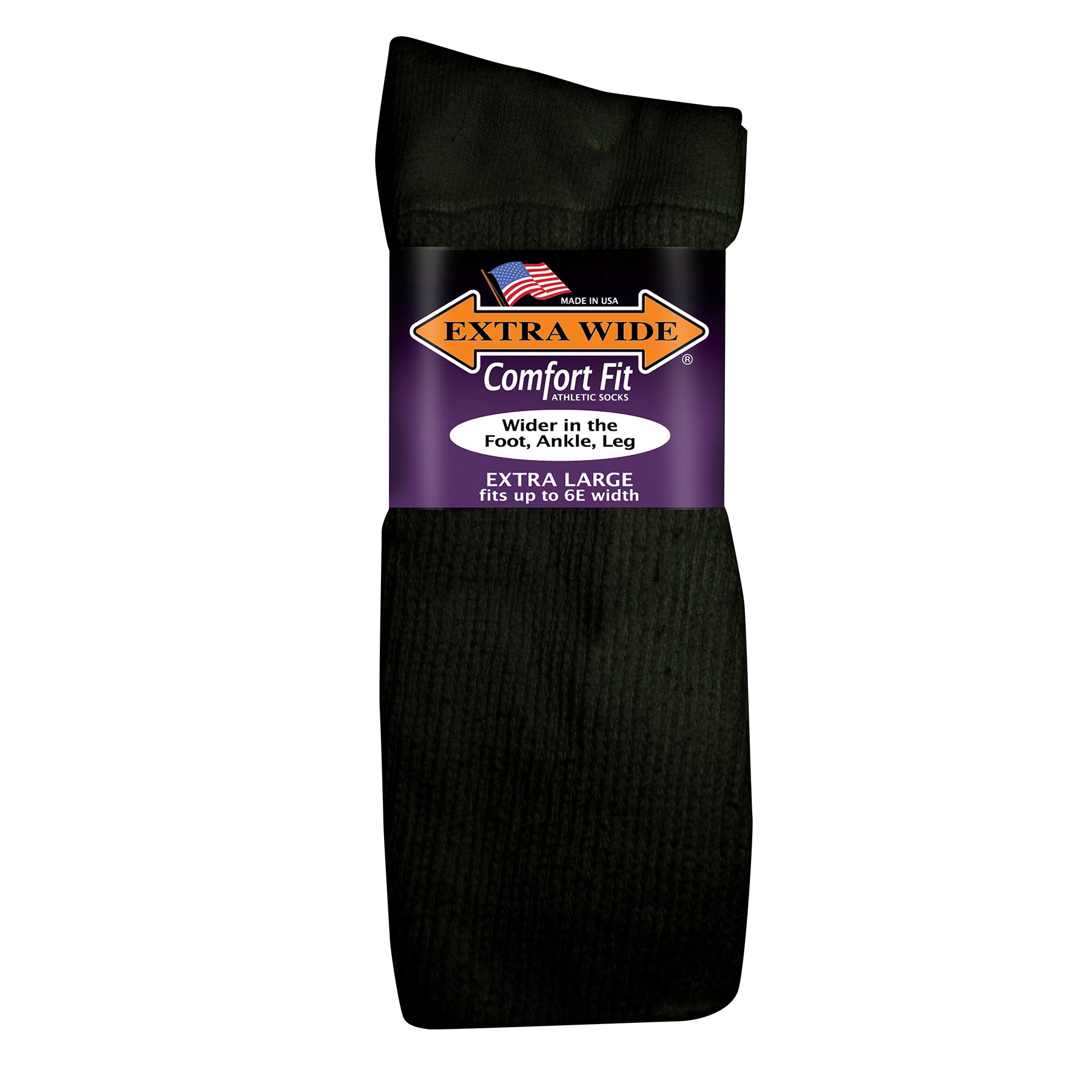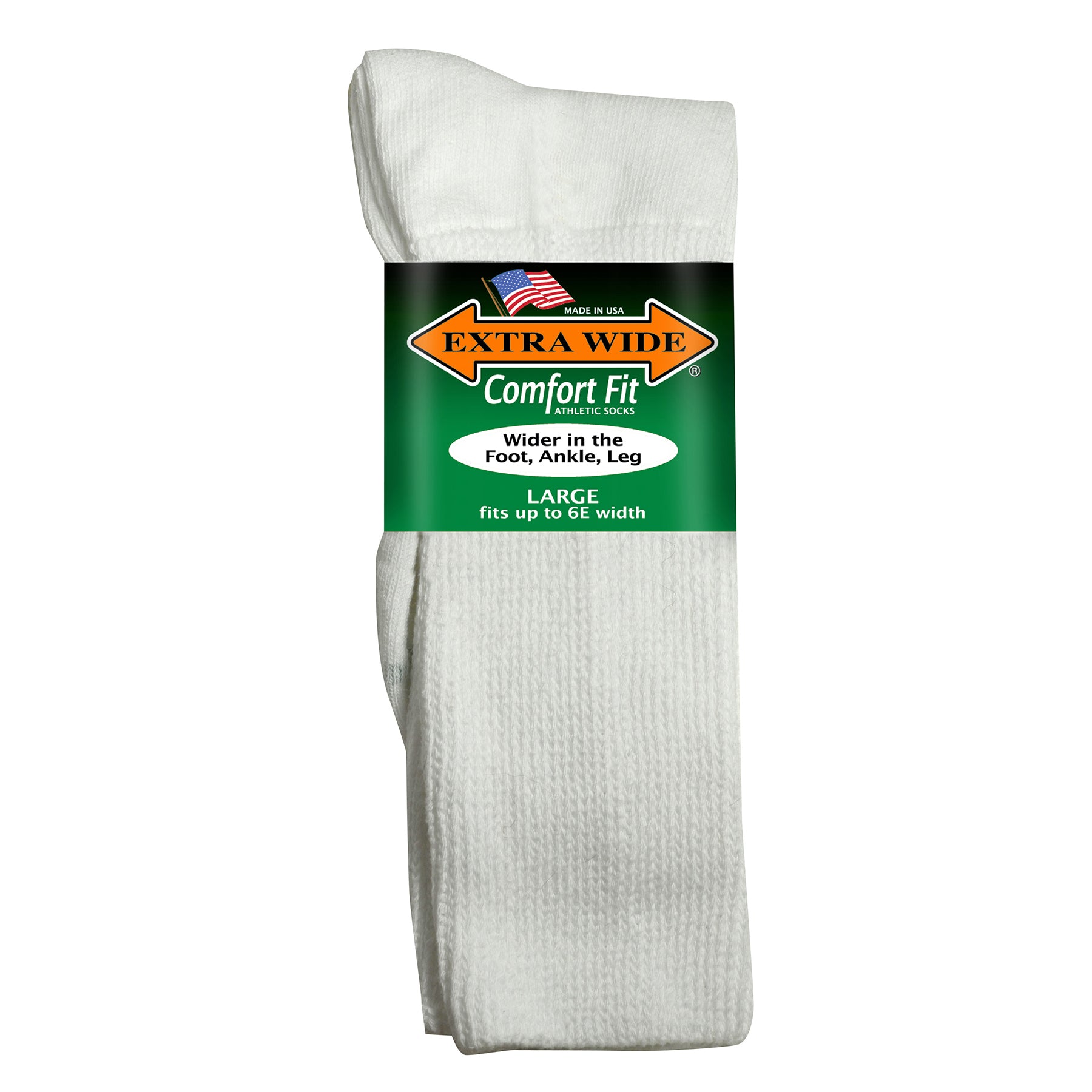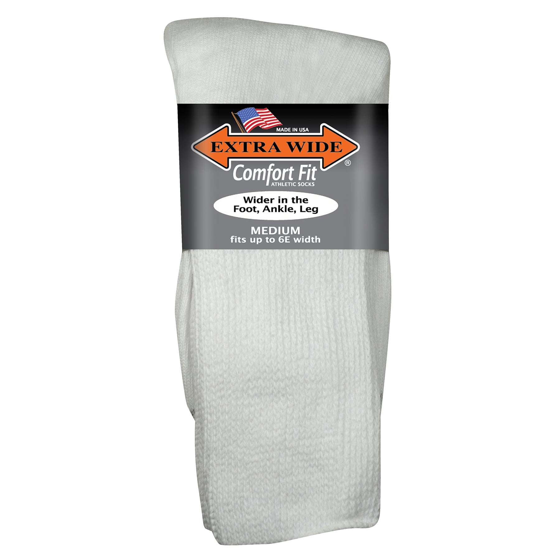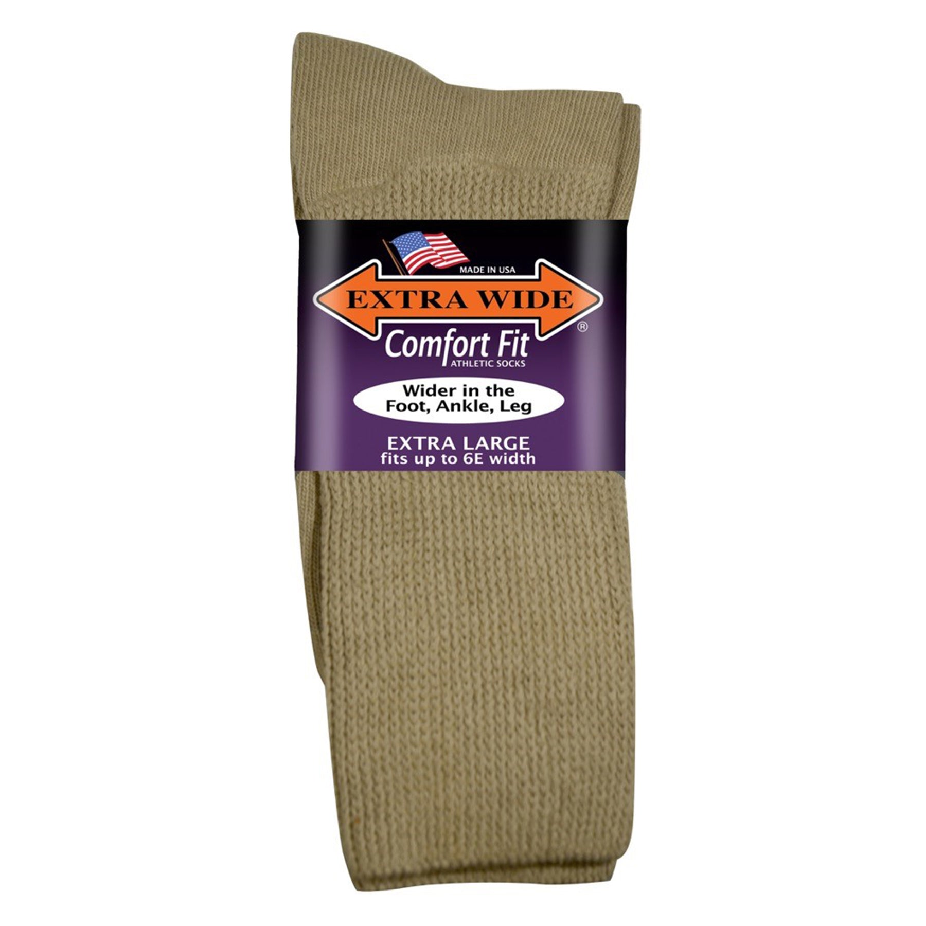 Extra Wide athletic crew socks are the socks that started it all! Designed for people who are tired of squeezing into tight fitting socks! Made from soft ring spun cotton, these socks can stretch up to 25 inches in the calf while still maintaining their shape. You no longer have to cut the top of your socks to create more room. Be a part of what people are talking about, it's time to treat your feet. Available in white, black, navy, and tan, and 4 sizes to ensure a correct and comfortable fit. The socks are unisex and fit shoe sizes from women’s size 7 all the way up to men’s size 21 up to a 6E width. Made in the USA!