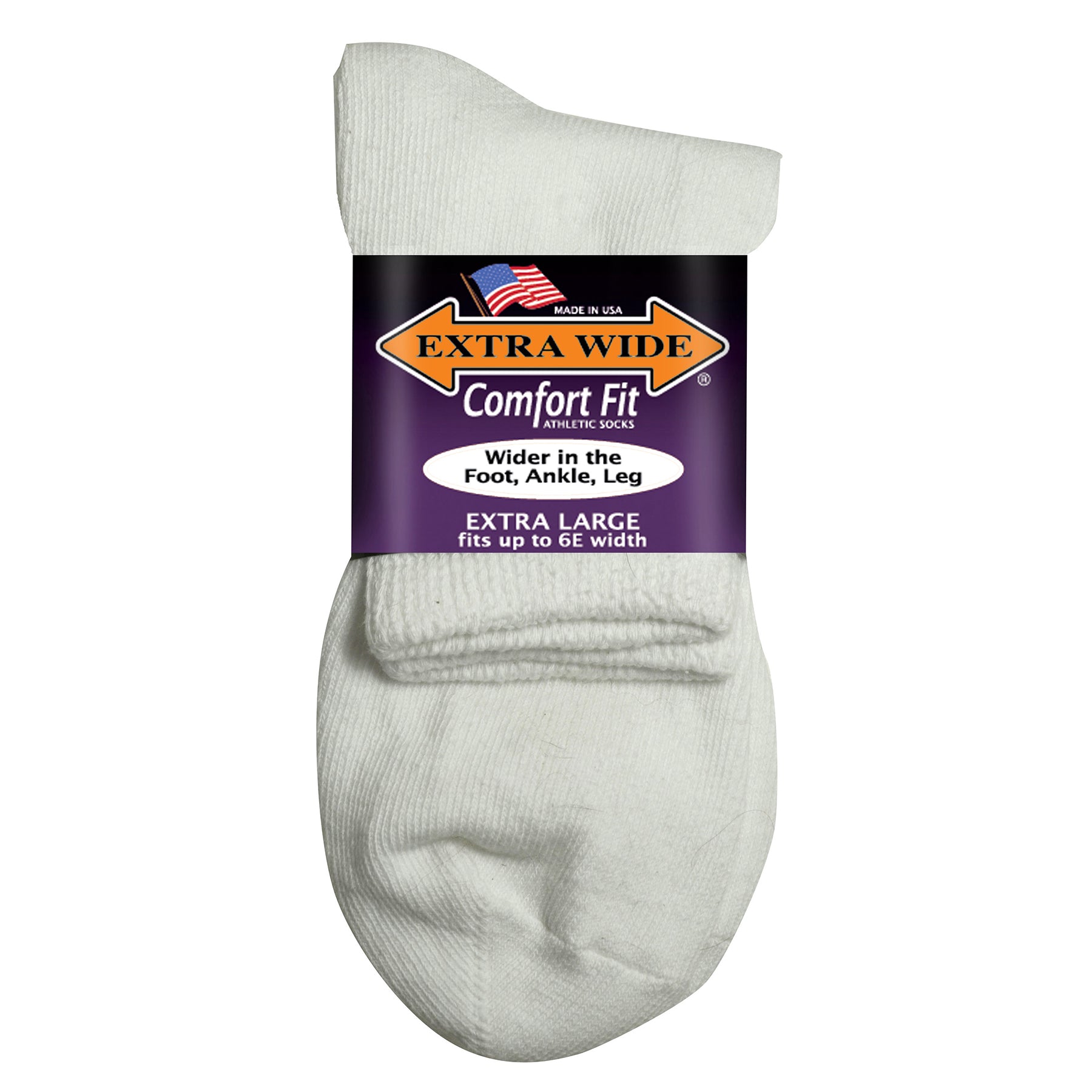 Look no further! Our Extra Wide quarter socks won’t squeeze your feet. These are the widest quarter socks on the market. Hike the trail, play with the kids, walk the dog. Give them a try and see what people are talking about. Made from soft ring spun cotton. They’re available in white and black, and 4 sizes to ensure a correct and comfortable fit. The socks are unisex and fit shoe sizes from women’s size 7 all the way up to men’s size 21 up to a 6E width. Made in the USA!
