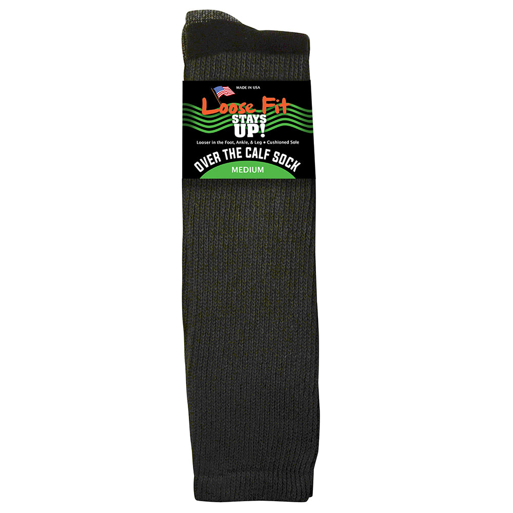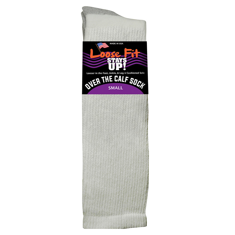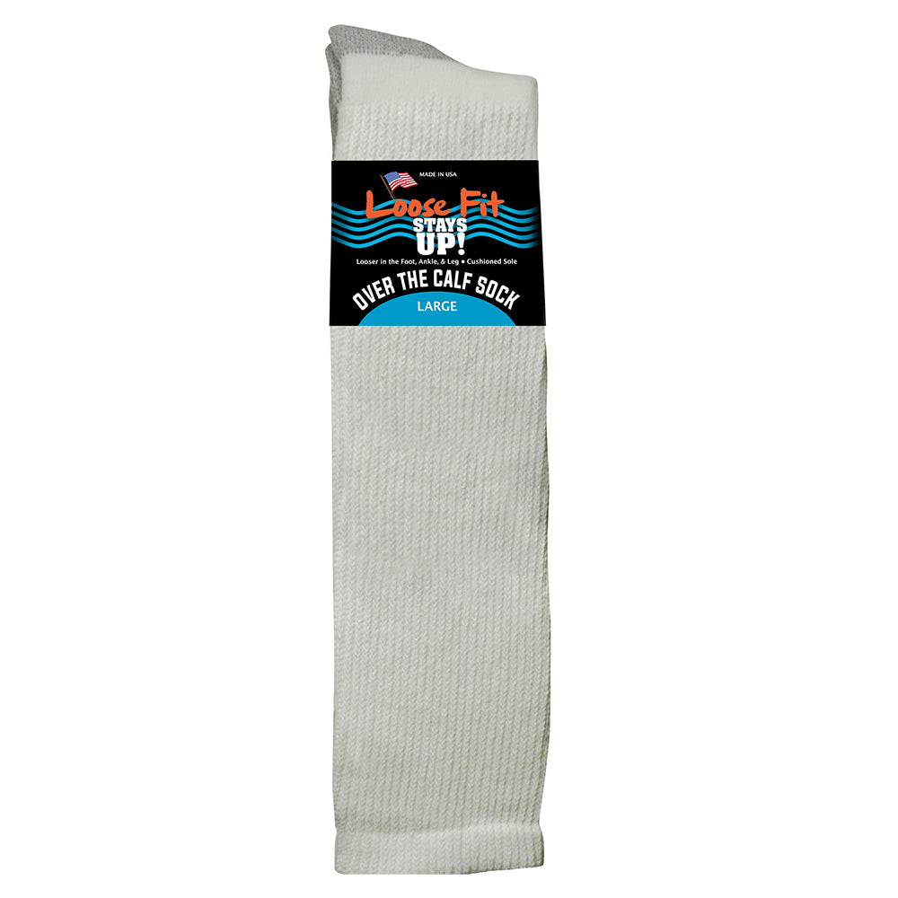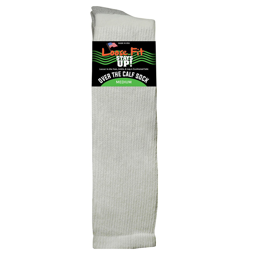 We’ve fit our Extra Wide customers with socks. Now it’s time to fit the rest of you who HATE tight socks! Our new Loose Fit Stays Up over the calf (OTC) Athletic sock fits regular size feet as well as wide feet. The incredible design fits loosely and still stays up, all the way up to your knees. They’re so easy to put on and take off. Designed for extreme comfort with a cushioned sole and ring spun cotton. You’ll never want to wear any other over the calf socks again! Wear them if you have mobility issues and have trouble getting your socks on and off. Wear them if you’re chubby around the middle and bending is a challenge. Wear them with tall boots, work boots, hunting boots, and more. Perfect for work, hunting, hiking, trekking, fishing and every day wear. Even wear them over your pants or leggings for added warmth or flea and tick protection. The socks break age barriers and are so versatile. Customers are raving that our Loose Fit Stays Up line are the best socks they’ve ever worn! It doesn’t get any better than that, and we couldn’t be more excited! Available in white and black and 4 sizes to ensure a correct and comfortable fit. The socks are unisex and fit shoe sizes from women’s size 6.5 through men’s size 19 up to a 3E width. Made in the USA!