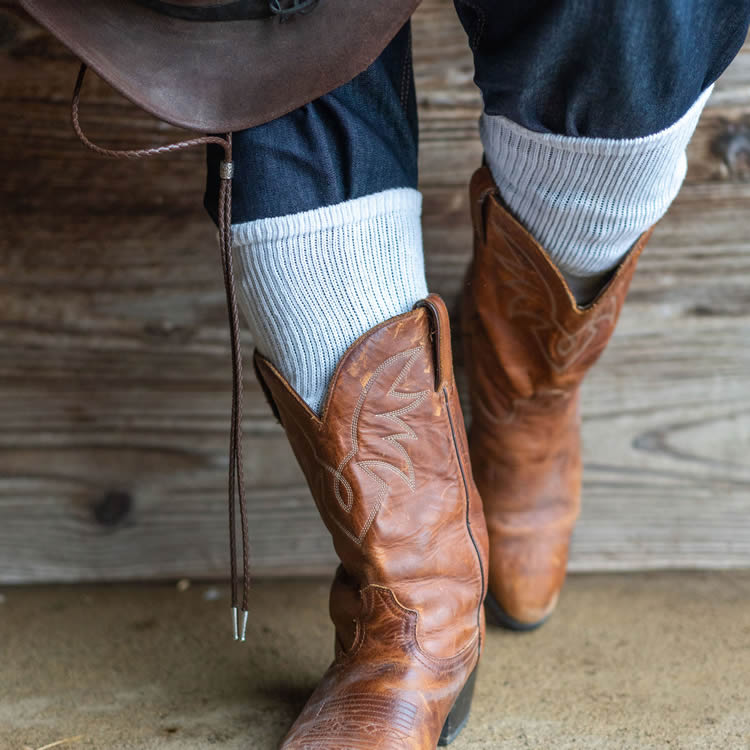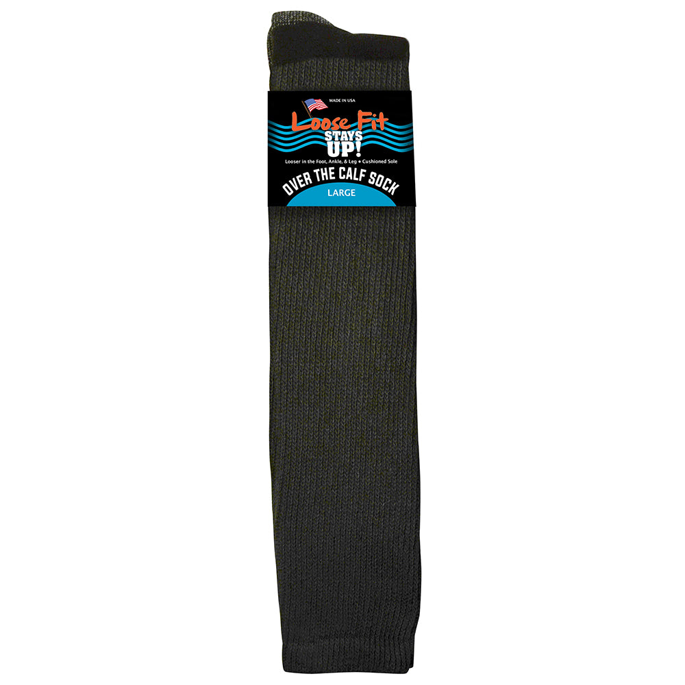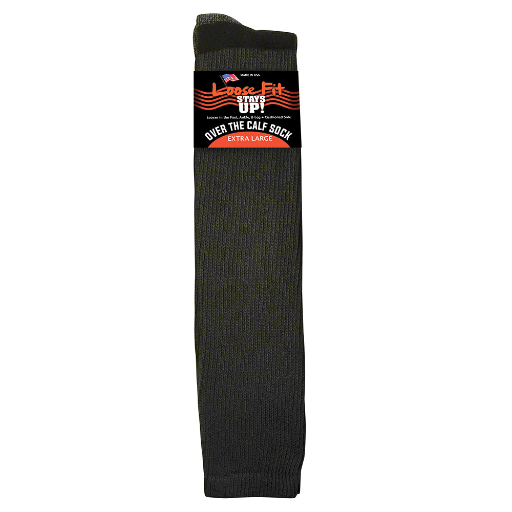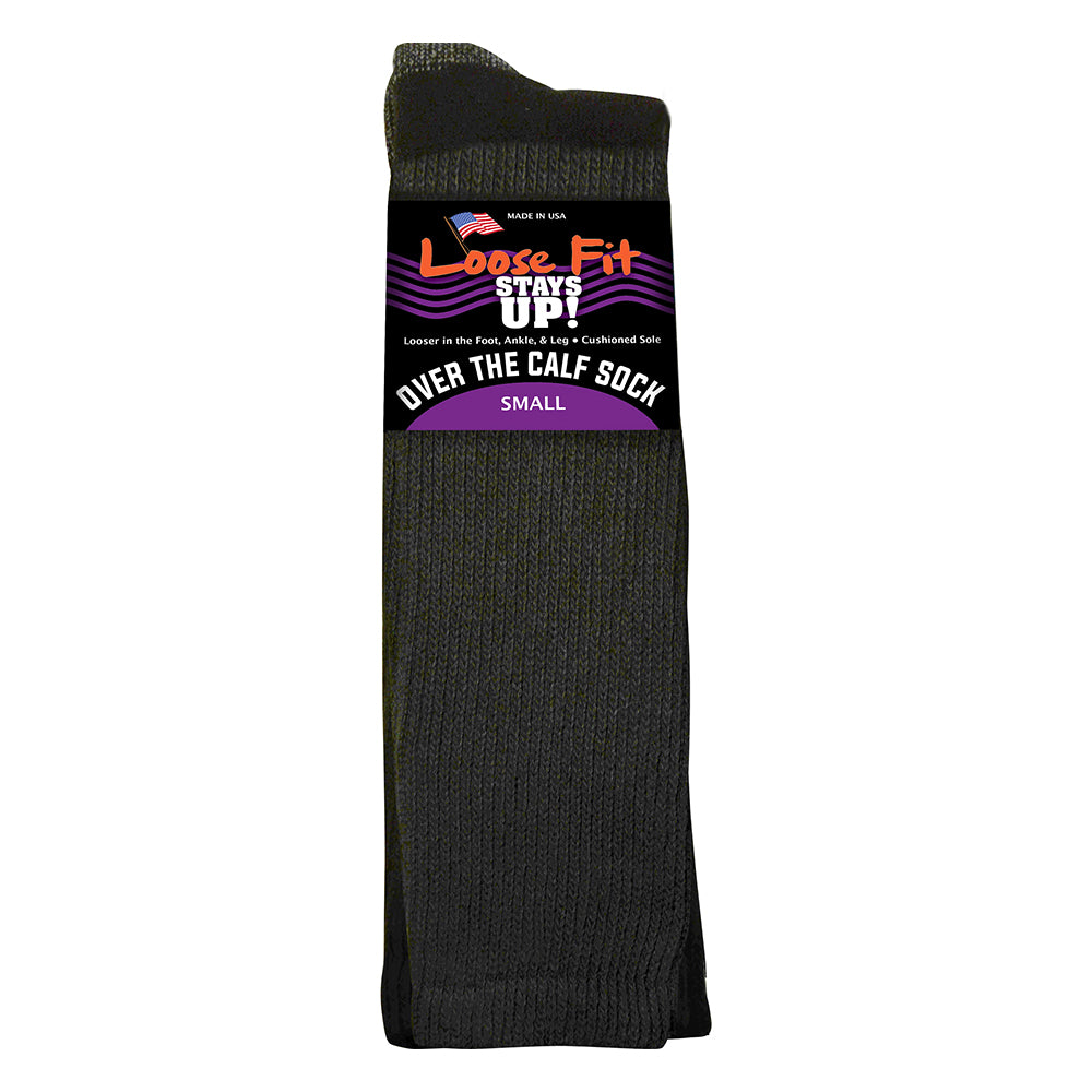 We’ve fit our Extra Wide customers with socks. Now it’s time to fit the rest of you who HATE tight socks! Our new Loose Fit Stays Up over the calf (OTC) Athletic sock fits regular size feet as well as wide feet. The incredible design fits loosely and still stays up, all the way up to your knees. They’re so easy to put on and take off. Designed for extreme comfort with a cushioned sole and ring spun cotton. You’ll never want to wear any other over the calf socks again! Wear them if you have mobility issues and have trouble getting your socks on and off. Wear them if you’re chubby around the middle and bending is a challenge. Wear them with tall boots, work boots, hunting boots, and more. Perfect for work, hunting, hiking, trekking, fishing and every day wear. Even wear them over your pants or leggings for added warmth or flea and tick protection. The socks break age barriers and are so versatile. Customers are raving that our Loose Fit Stays Up line are the best socks they’ve ever worn! It doesn’t get any better than that, and we couldn’t be more excited! Available in white and black and 4 sizes to ensure a correct and comfortable fit. The socks are unisex and fit shoe sizes from women’s size 6.5 through men’s size 19 up to a 3E width. Made in the USA!